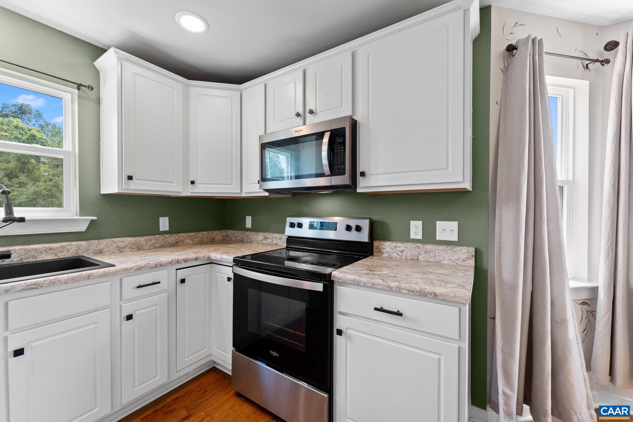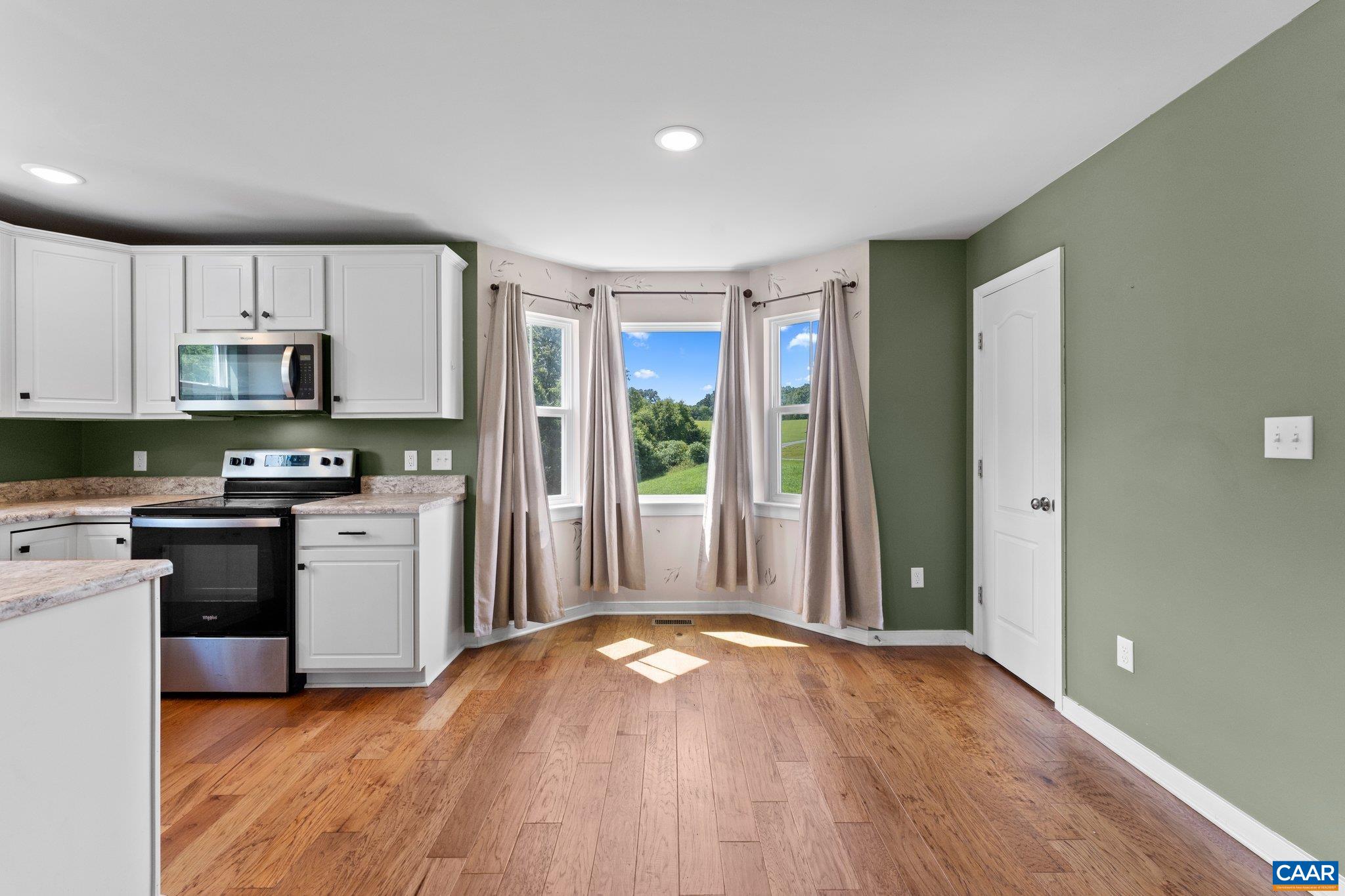 Charming 4BR/2BA home nestled in a quiet cul-de-sac with scenic pastoral and wooded views. Enjoy peaceful outdoor living on the spacious back deck overlooking the private backyard. Interior features include an open floor plan, abundant natural light, and neutral paint tones throughout. The main level boasts engineered hardwood floors and a large bay window in the breakfast nook. The kitchen is well-appointed with white cabinetry, white countertops, island, and a modern black sink—ideal for cooking and entertaining. The primary suite includes an en suite bath with a white ceramic tile shower. Additional highlights: Starlink Satellite internet (to convey), serene setting, and just under 20 miles to downtown Charlottesville. A perfect blend of comfort, privacy, and convenience.