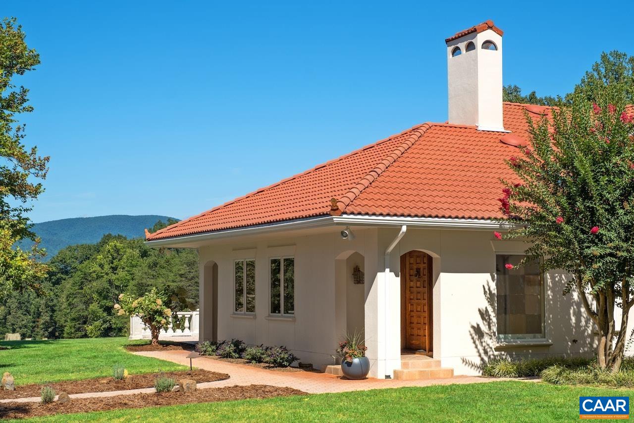 Mediterranean inspired and designed with amazing mountain views and privacy! The approach to the home is magnificent, but the views upon arrival will take your breath away. Be mesmerized by the sweeping pastoral and mountain views from inside with large windows to frame the view and from outdoors - arbor covered courtyard with water feature, patio, deck, or pool and small pool house with mini kitchen. Comprised of nearly 100 acres with an estimated 30+ acres of pasture and balance in woods and creeks for hiking or exploring AND includes 2 extra parcels if family wants to build nearby. The architectural design and Smith and Robertson custom construction brought the owner's vision to life with custom details in porches, arches, lighting, and handcrafted tiles. Features: vaulted ceilings, sky lights, hardwood floors, wood trim and doors, wood stove insert, fiber optic internet, spacious rooms and many extra living spaces such as home office, den, upstairs guest suite or apartment with mini kitchen, and a basement offering space for recreation, exercise, guests, or storage. Coveted Afton location only 1.5 miles to Rt 151 and the wine and brew trail, 10 min to Nellysford town hub, and 30 min to Charlottesville