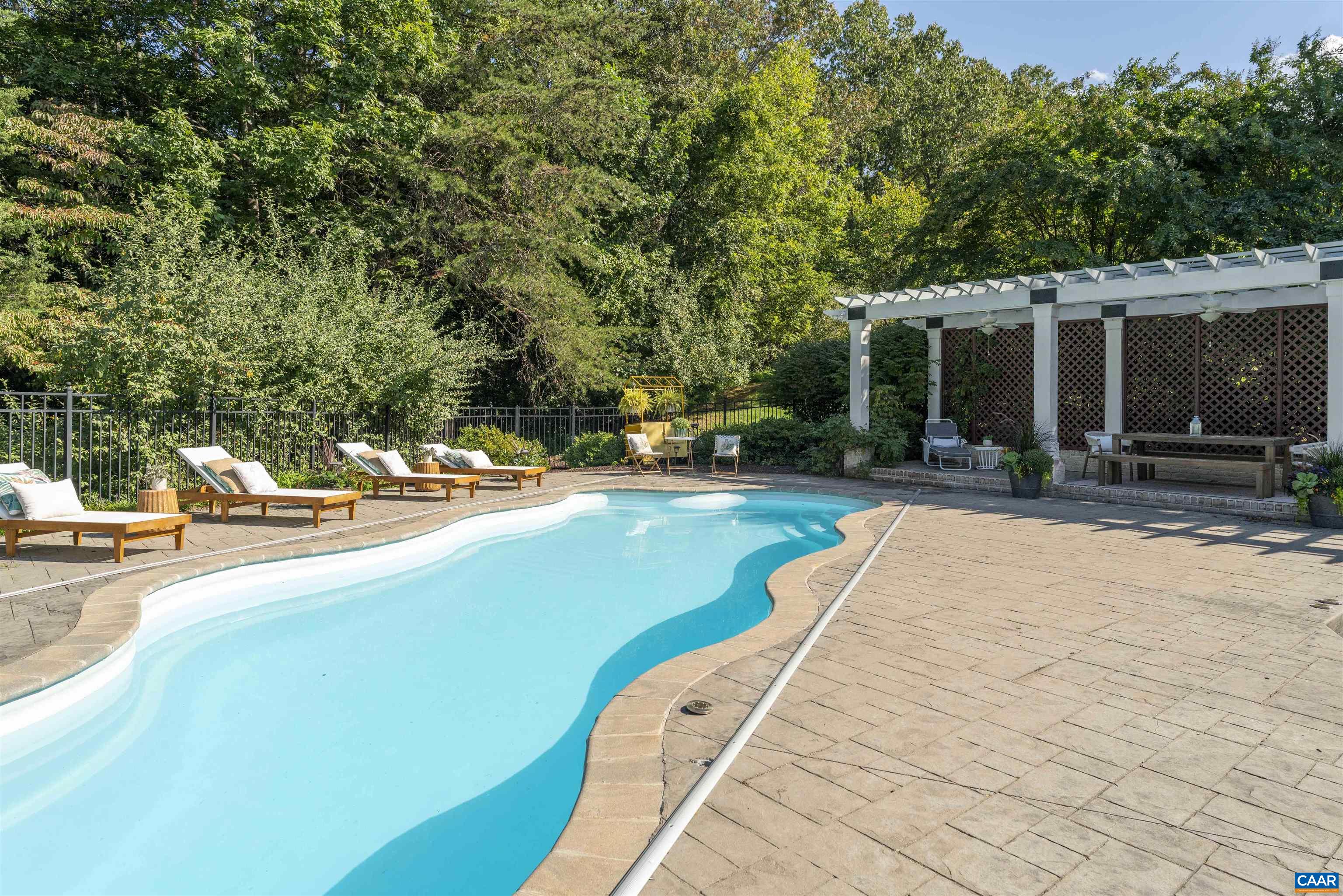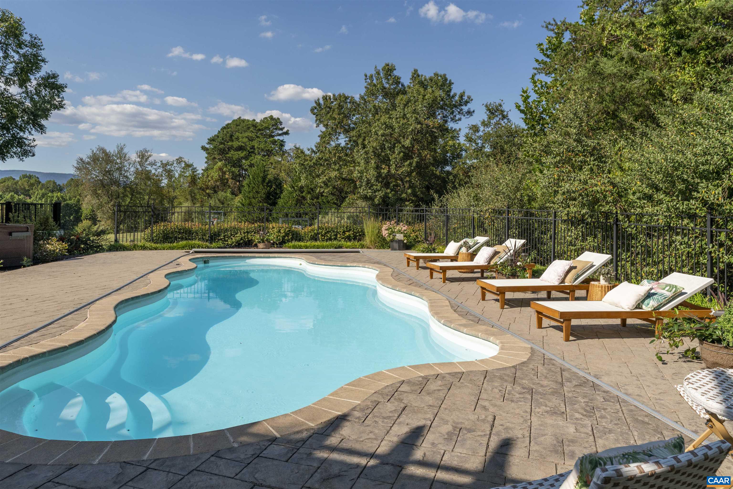 Top Quality, Custom Home in Ivy set on 5 acres with mountain views....Extended living space with swimming pool and full size tennis/sport court....Covered terrace pavilions overlook expansive lawn and recreation areas. Bright, expansive interior spaces flow comfortably...The vaulted great room opens to the gourmet kitchen and breakfast room...2 primary suites on the first floor...The upper floors feature 3 additional suites (with fabulous closet spaces) and a billiard room... Terrace level features a family room with bar, movie room, craft/hobby room, home office and a full bath... Easy access mechanical room houses the Geothermal system and still room for a storage room...Central vacuum system, irrigation system, & invisible fence...