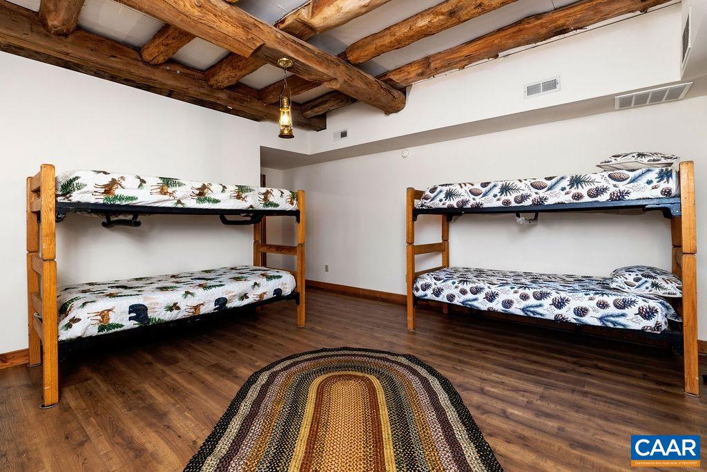There is truly nothing else like this at Wintergreen—an authentic circa 1801 log cabin, originally built in Madison County and reconstructed in 2000 by renowned builder Lewis Ramsey and his son, Luke. Featured in Historic Preservation Magazine for his craftsmanship, Ramsey used hand-hewn chestnut, poplar, and oak logs that reflect early Virginia building traditions. The kitchen, a historic structure of similar age moved from Nelson County, blends beautifully with the cabin. Master stonemason Jimmy Arrington created the striking dry-stack fireplaces, while the standing-seam copper roof by Harold Conley & Sons and reclaimed heart-pine floors on the main and upper levels add exceptional warmth and character. Highlights include four fireplaces (two gas, two wood-burning), cathedral ceilings in the kitchen and dining area, new LVT flooring on the lower level, new granite kitchen counters, level driveway, and multiple outdoor living spaces. Privately set among dramatic rock formations near the ski shuttle and hiking trails, this is a true historic treasure and a remarkable rental opportunity.