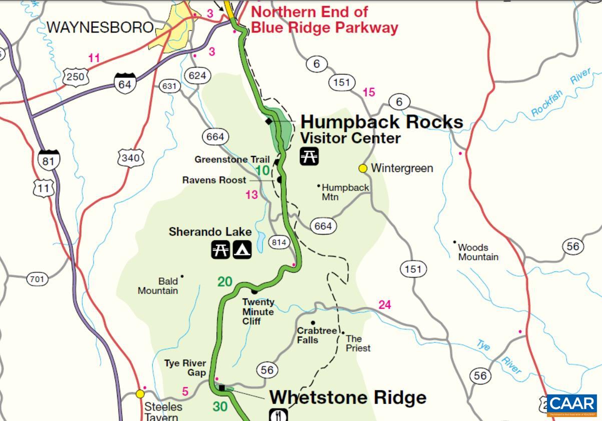 Directions: From Sherando Lake Recreation Area Mt. Torrey Rd (St Rte 664) straight onto State Rte 814 3.8 mi Turn right onto Blue Ridge Pkwy 0.6 mi Sharp left at mailbox (16903 Blue Ridge Pkwy) down 0.3 mi gravel driveway