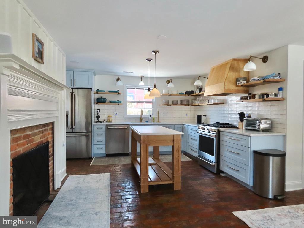 A DELIGHTFUL TOWN AND COUNTRY HOME tastefully remodeled and in excellent condition. The earliest portion is an 1890 residence. The brick section is believed converted from an early Farrier's shop. Handsome log beams, exquisite fireplace mantels, and polished brick flooring are historically reminiscent and a perfect setting for relaxing or entertaining. Central foyer entry with stairs up. Comfortable 19 x 20 living room with fireplace and French doors to the back gardens. Completely redesigned kitchen offers Carrara marble island and counters, custom designed cabinets and shelving, Bespoke light fixtures and Café appliances including a six burner gas stove. Dining room is 12'6" x 24 with fireplace and French doors to the screened porch. Second floor comprises a stunning primary suite with Juliette balcony and delightful ensuite bath. Also the second bedroom with fireplace and bath. The original 1890 section offers the original living room (now the den with fireplace), original kitchen (fully plumbed) with laundry and an upstairs bedroom and full bath. Private lawn and flowering gardens, four fireplaces, four full baths (three up, one down) and modern 2 zone HVAC. ***NOTE: The 1890 residence section may serve as a closed unit with