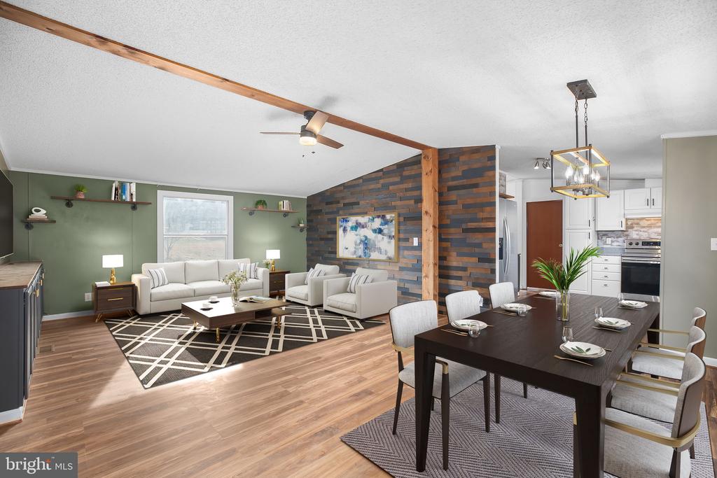 The smell of fresh coffee drifts through an airy kitchen as sunlight spills across refurbished wood shelving and a brick backsplash, bouncing softly off sleek stainless appliances. A quiet morning unfolds just beyond the windows””five private acres stretching out beneath mature trees, tucked near the end of a non-thru street. Peaceful, but never isolated. Inside, 1,250 square feet of thoughtful updates capture attention immediately: exposed beams draw the eye toward vaulted ceilings, a stylish feature wall anchors the family room, and wide-plank wood laminate flooring flows throughout with warm, cohesive character. Every detail feels intentional, right down to the Smart House upgrades””voice-controlled smart plugs throughout the interior and Blink Security floodlights positioned at the front and rear, bringing both convenience and peace of mind. The kitchen wasn't just updated””it was reimagined. Clean lines in white cabinetry, a modern layout with updated countertops, and handcrafted open shelving offer personality as well as function. Both bathrooms heighten the design aesthetic, with fresh tile, contemporary vanities, and a new walk-in shower in the ensuite. Comfort extends to the essentials: a new well pump (2023), an expanded